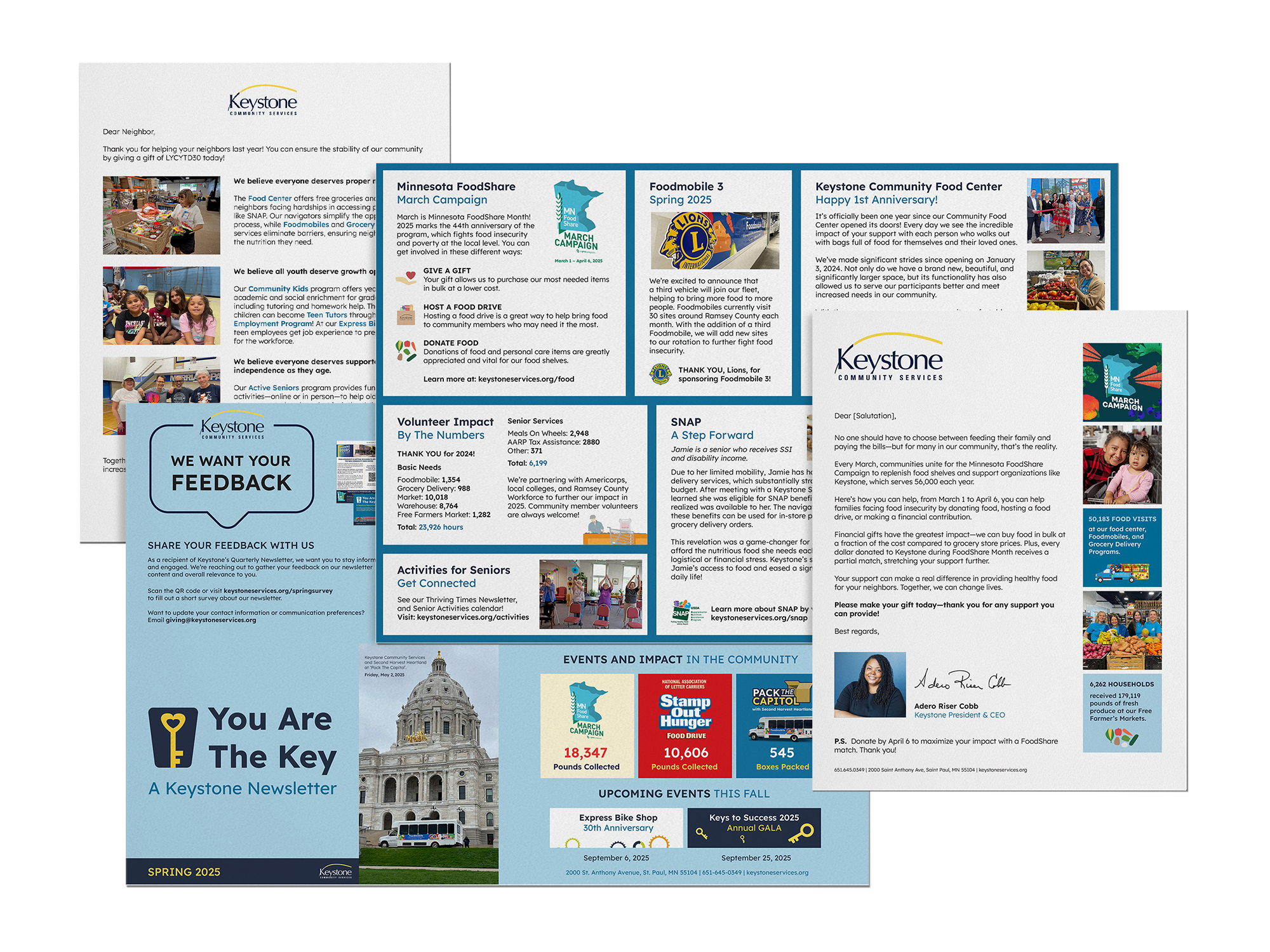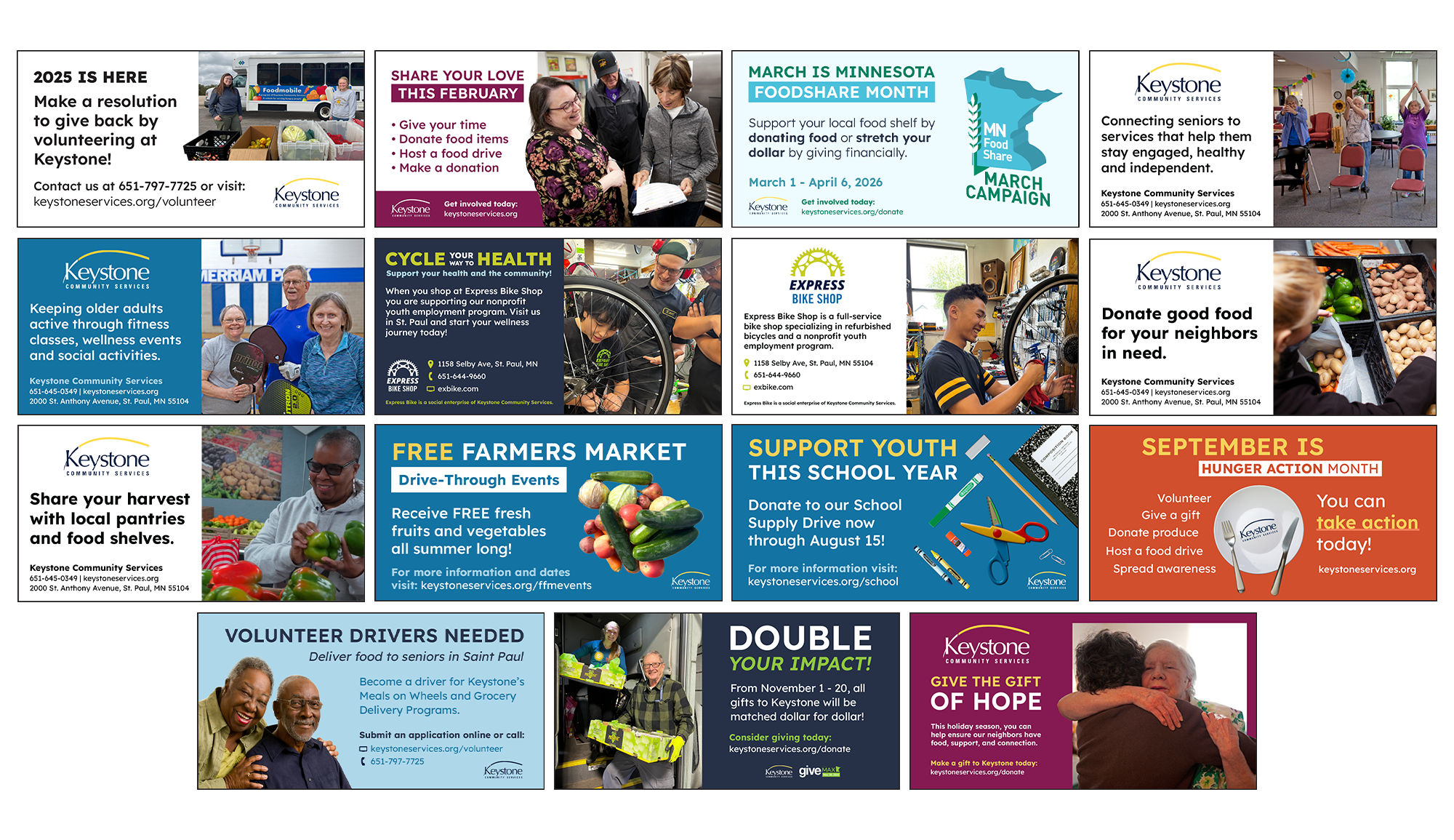 One of my goals at Keystone was to shift the focus of the quarterly newsletter from being primarily food (Basic Needs Services) focused to highlighting different areas by including Seniors Services, Youth Service stories and Express Bike Shop news. I worked with various department directors to gather content, the advancement team for a mailing list, and print vendors to ensure the mailer went out on time.