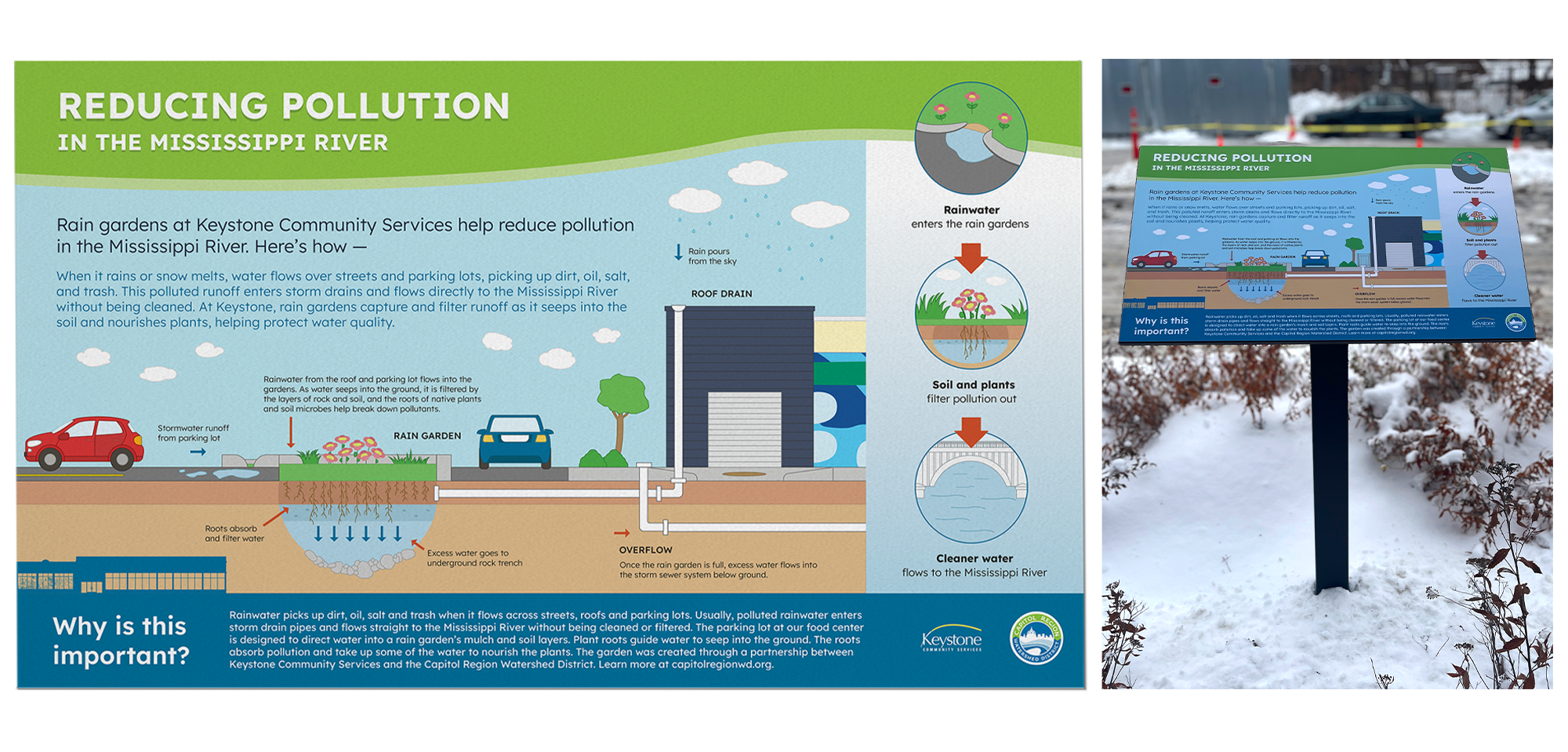 I worked with the Capitol Region Watershed District and Advancement Director to create a rain garden sign to place at Keystone's Community Food Center. The project required me to illustrate the process and to make sure the sign met the requirements laid out by the CRWD. The sign was installed at the Keystone Community Food Center and available to view as of December 2025.